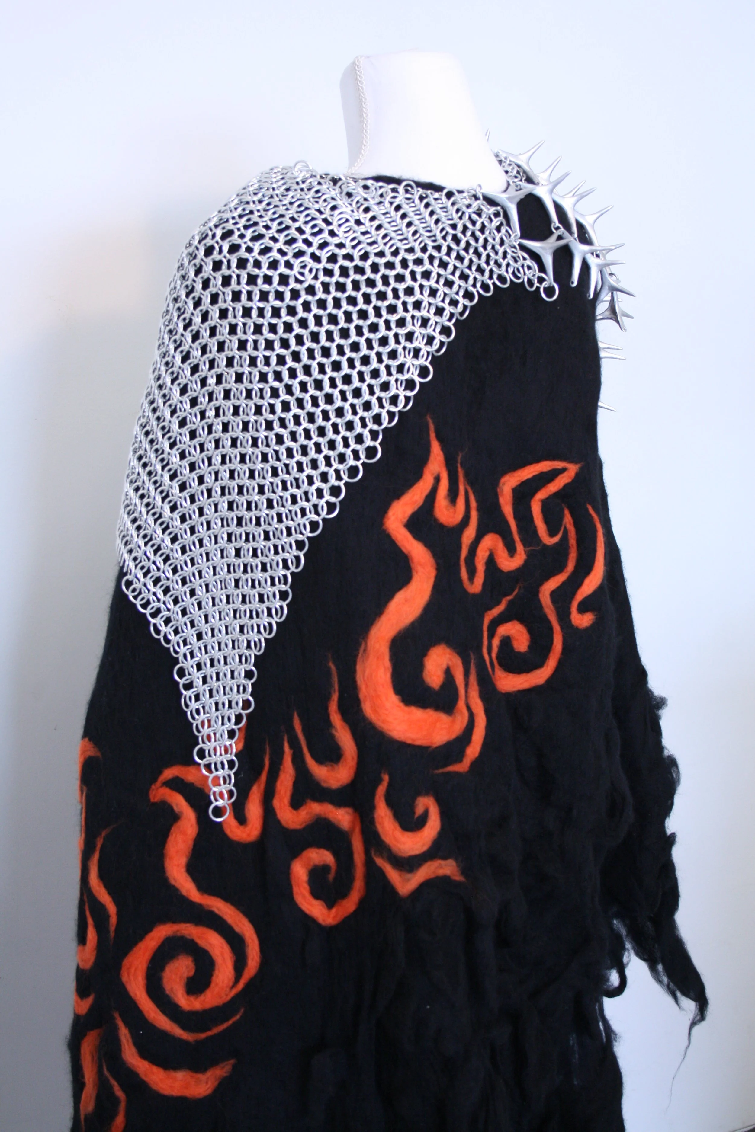A cloak made of cast aluminum spikes also used in “Modern Armor 1,” chain mail, and felt. The cloak is a cover of the entire body, starting off sturdy towards the neck which erodes into softer material which grows more tattered towards the bottom. It represents my relationship with self vs the rest of the world.